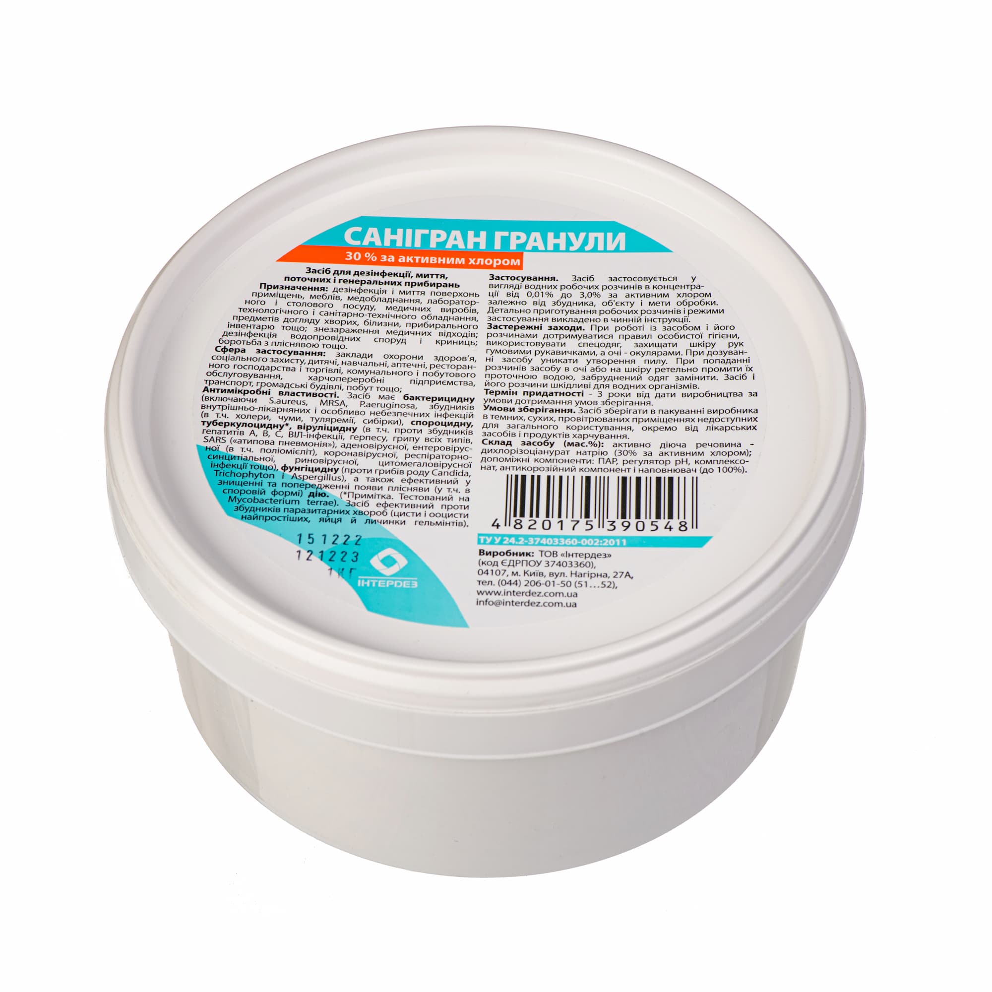 Активно-діюча речовина: натрієва сіль дихлорізоціанурової кислоти – не менше 30 мас.% або 45 мас.% за активним хлором.